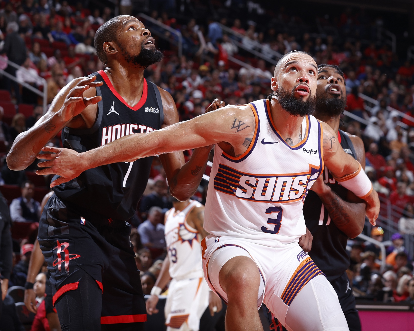 太阳派狄龙主防杜兰特,马威单防申京,对位单防上完全不吃亏:杜兰特首节6中1,申京首节4中0,单打强攻都被太阳的防守硬度化解——杜兰特和申京首节合计10中1,火箭阵地战进攻崩盘。